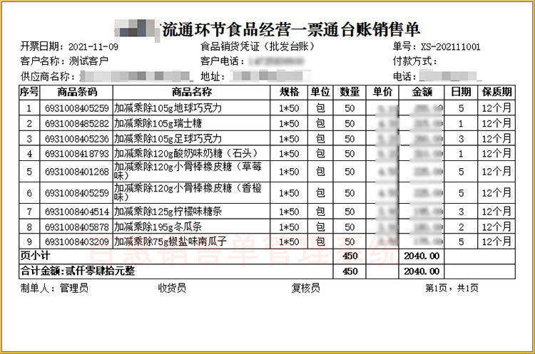 干货副食调味品、米面粮油杂货海味、食品销售一票通票据打印格式模板展示