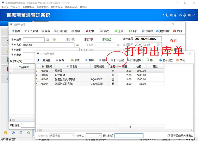 百惠进销存管理系统是在销售流程中实现一单两用,打印送货单交客户,并根据物料清单,自动计算用量,生成材料清单,扣减材料库存,仓库可以同步打印出库单,减轻工作量。