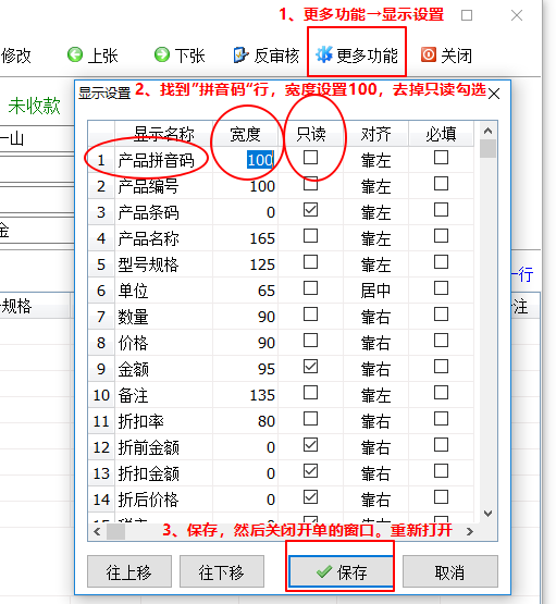 这时候,有用户可能会问了:为什么我的用的百惠销售单管理系统,产品资料表格没有这一列的?答:因为这里默认没有启用的。如果需要使用这个功能,设置一下就好了。在右上角的“更多功能——显示设置”。如下图: