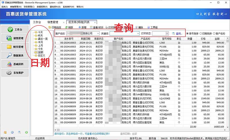 来源:送货单历史数据导出备份 发布时间:2024-12-03 浏览:2104作为一款专业的送货单管理系统,百惠送货单系统可以快速高效地保存查询单据、生成对账单、统计数据、打印标签等。为了带来更快速更准确的业务处理体验,在查询历史送货单时,送货单数据支持一键导出到Excel表格。下面提供具体操作步骤。