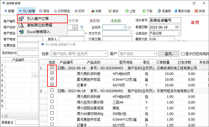 录入客户订单,需要送货的时候直接引入订单送货出库。
