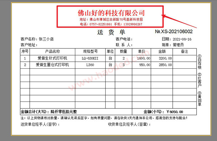 3、保存成功后,送货单的抬头就是刚才设置好的内容了。